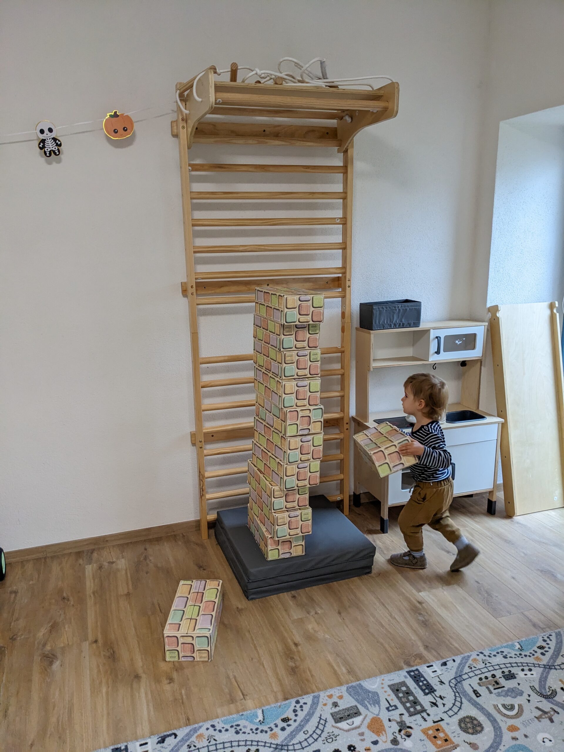 Sportovní aktivitou na celý listopad byla gymnastika. Děti si oblíbily především žebřiny, na kterých jsme zkoušeli nejrůznější zpevňovací a posilovací cviky. Pro malé bobříky jsme připravovali aktivity, cvičení a opičí dráhy, na kterých si děti trénovaly svou všestrannost, celkovou tělesnou zdatnost a orientaci v prostoru. Využívali jsme také jógové bločky, kruhy a balóny.